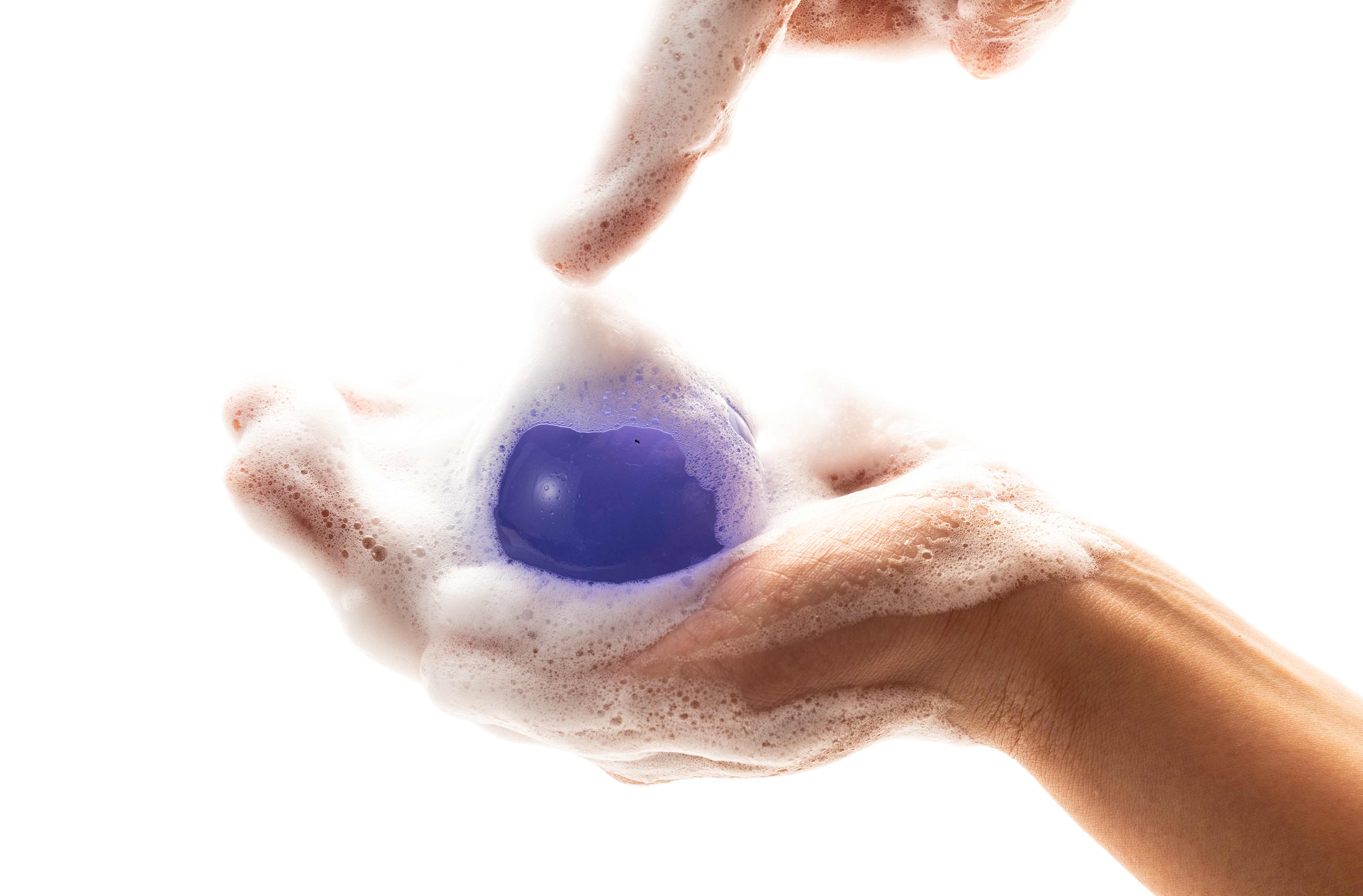 請使用隨附的牙籤,從托盤上方貼紙的中央戳破,割開橡膠氣球般的外膜取出內容物。將皂體沾水後充分起泡後使用。